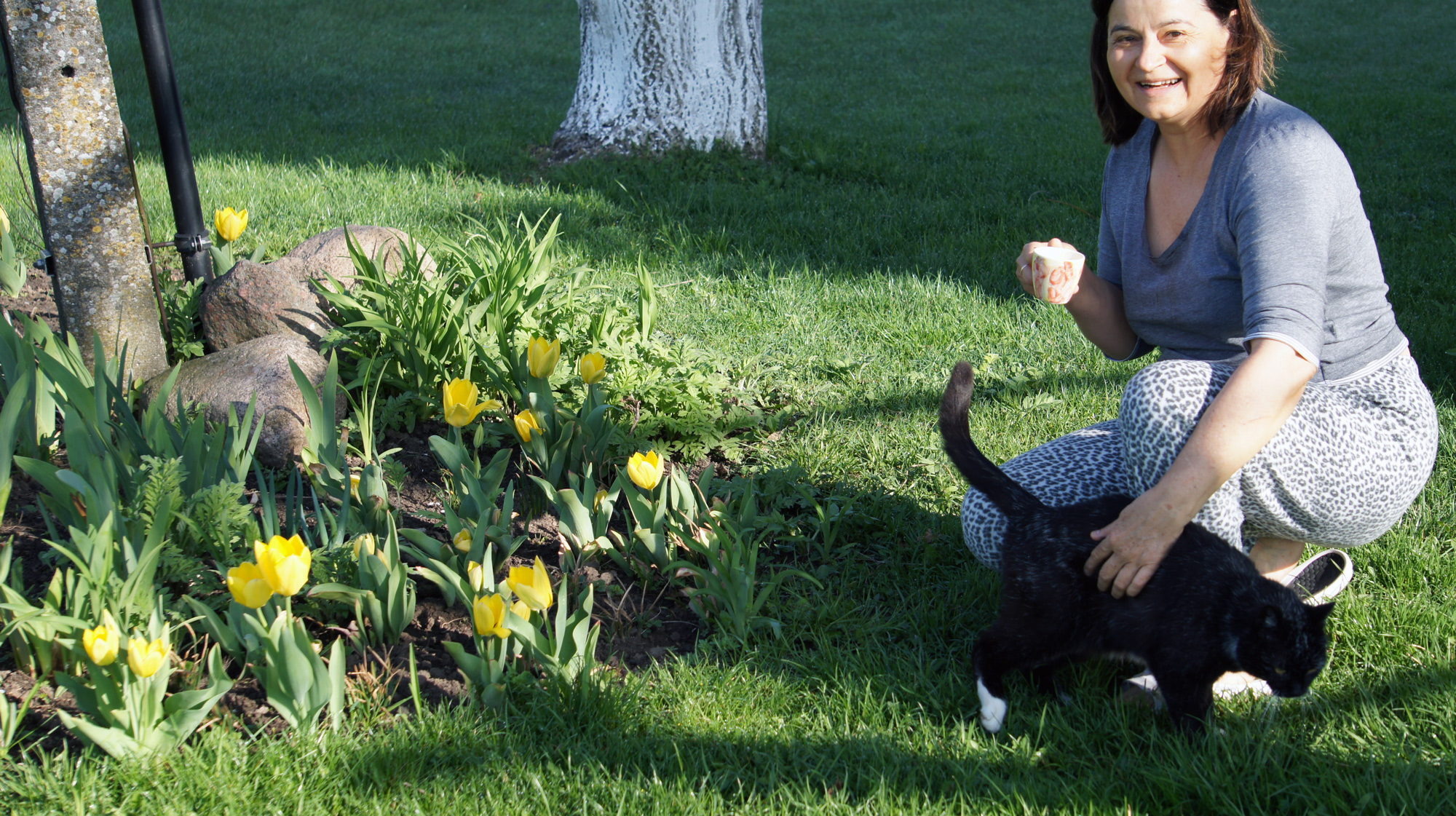 Bożena Bednarek-Michalska z kotką Fruzią w ogrodzie w Pluskowęsach