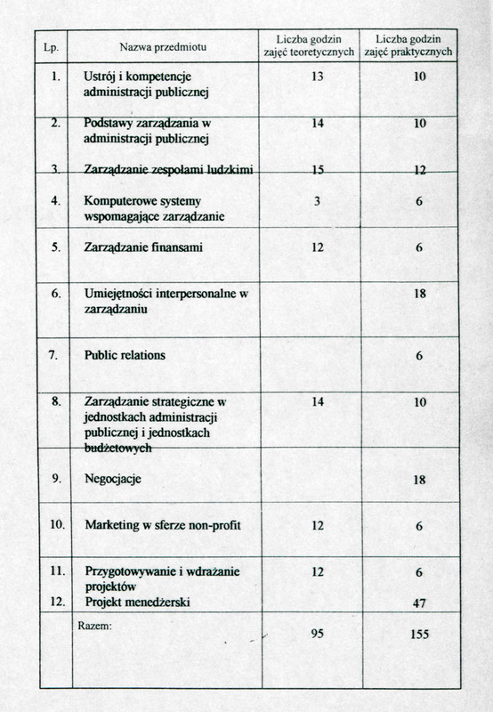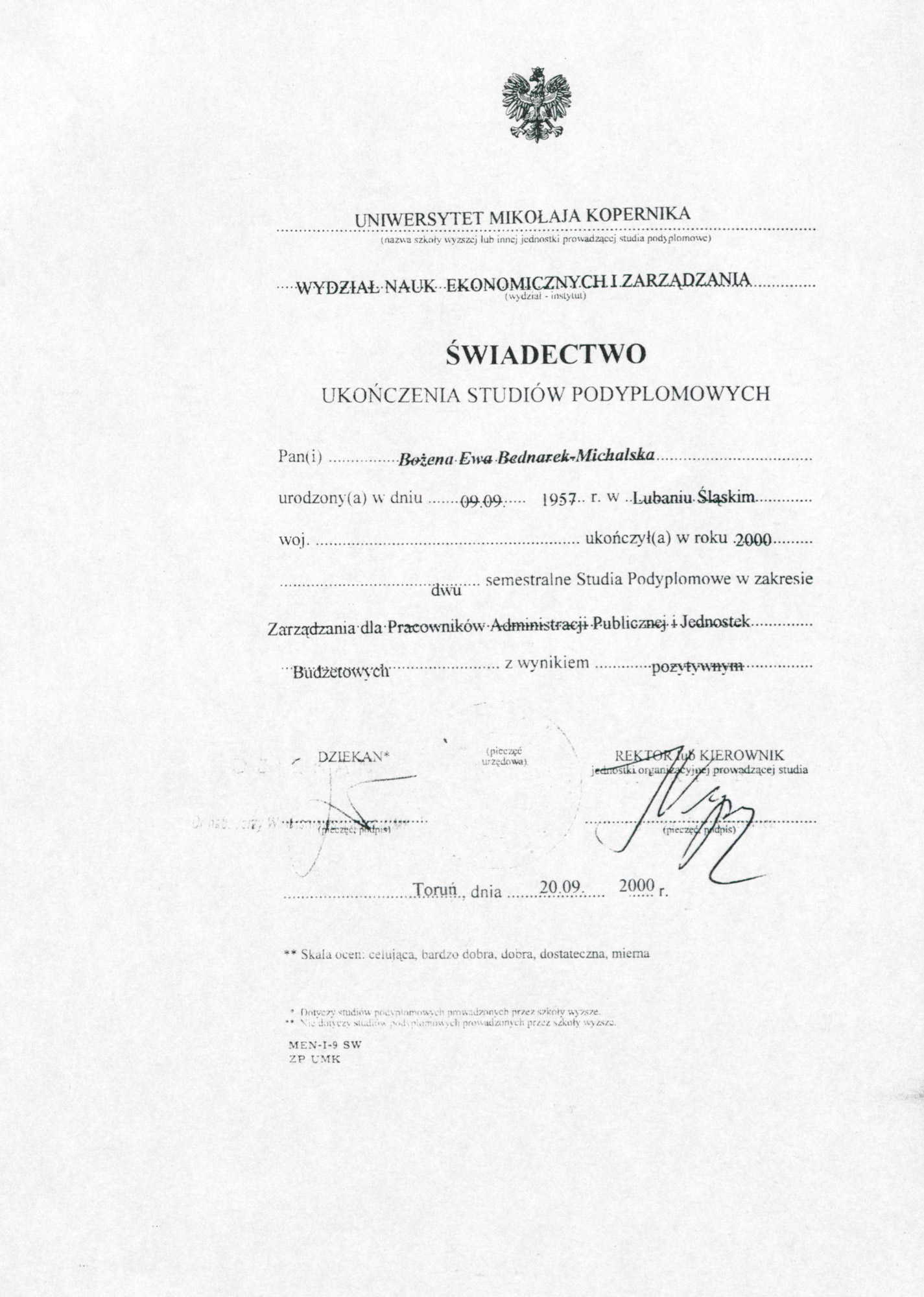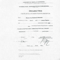 Świadectwo ukończenia Studiów Podyplomowych w zakresie Zarządzania dla Pracowników Administracji Publicznej i Jednostek Budżetowych na Wydziale Nauk Ekonomicznych i Zarządzania UMK