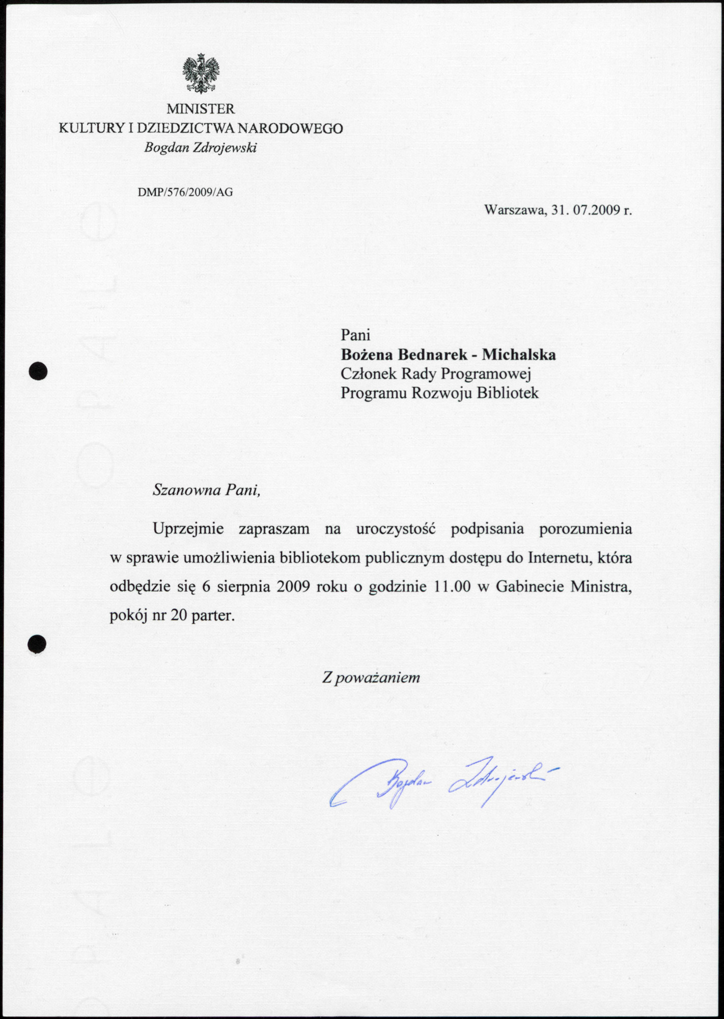 Zaproszenie na uroczystość podpisania porozumienia w sprawie umożliwienia bibliotekom publicznym dostępu do Internetu w ramach Programu Rozwoju Bibliotek