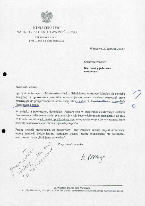 Opinia w sprawie uwag systemowych do Ustawy z dnia 30 kwietnia 2010 r. o zasadach finansowania nauki na prośbę Ministerstwa Nauki i Szkolnictwa Wyższego