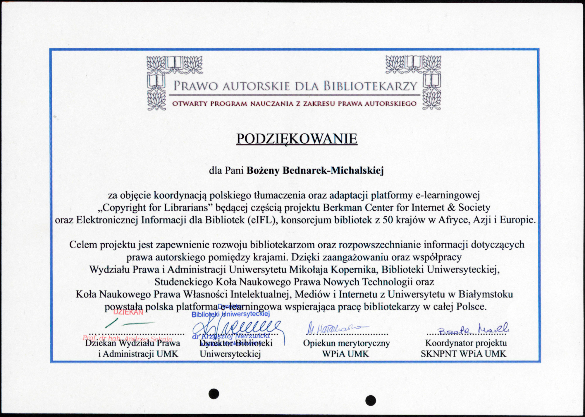Podziękowanie za objęcie koordynacją polskiego tłumaczenia oraz adaptacji platformy e-learningowej “Copyright for Librarians”, będącej częścią projektu Berkman Center for Internet & Society (Harvard University) oraz Elektronicznej Informacji dla Bibliotek (eIFL), konsorcjum bibliotek z 50 krajów w Afryce, Azji i Europie