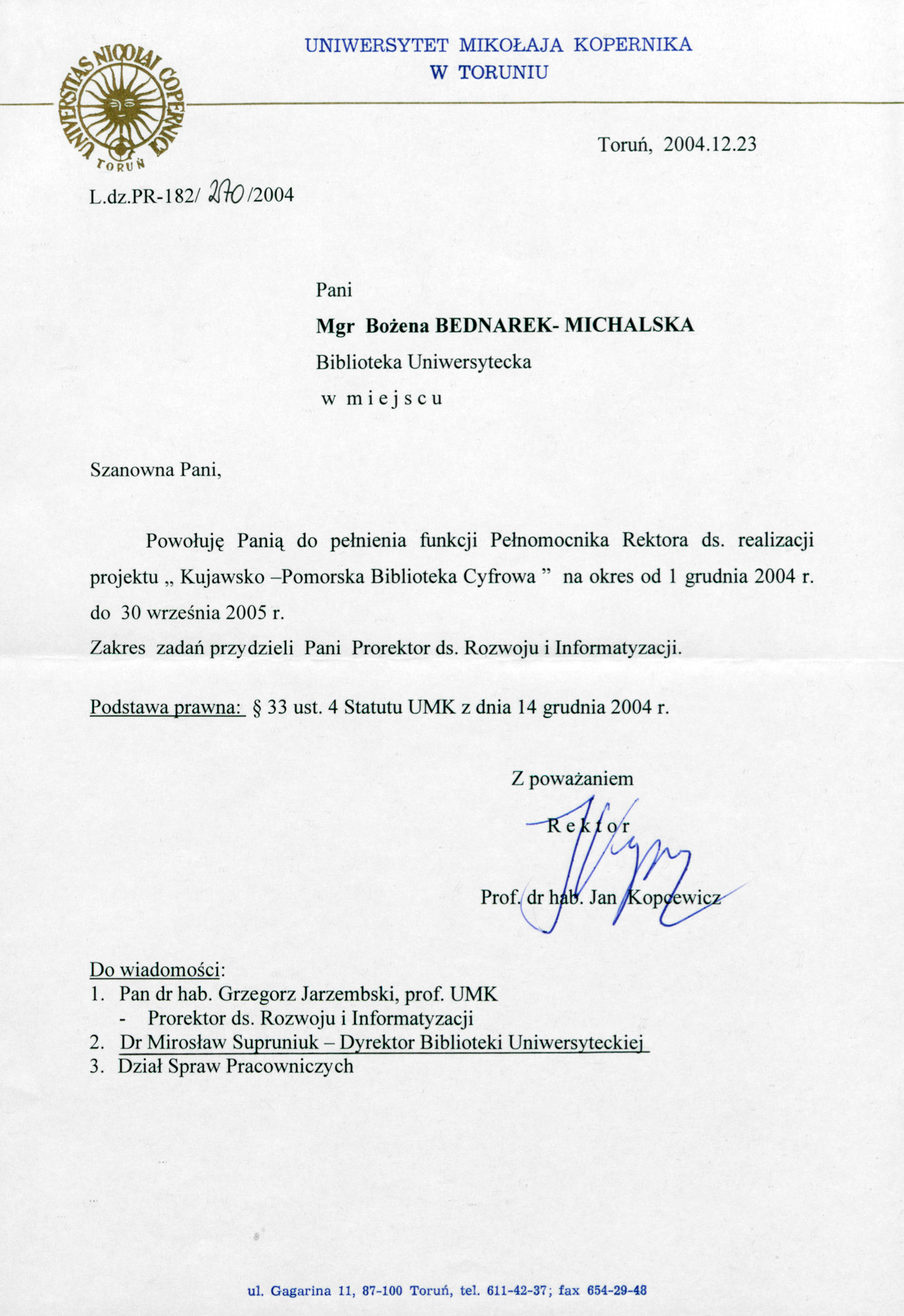 Powołanie do pełnienia funkcji Pełnomocnika Rektora ds. realizacji projektu “Kujawsko-Pomorska Biblioteka Cyfrowa” na okres od 1 grudnia 2004 r. do 30 września 2005 r.