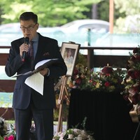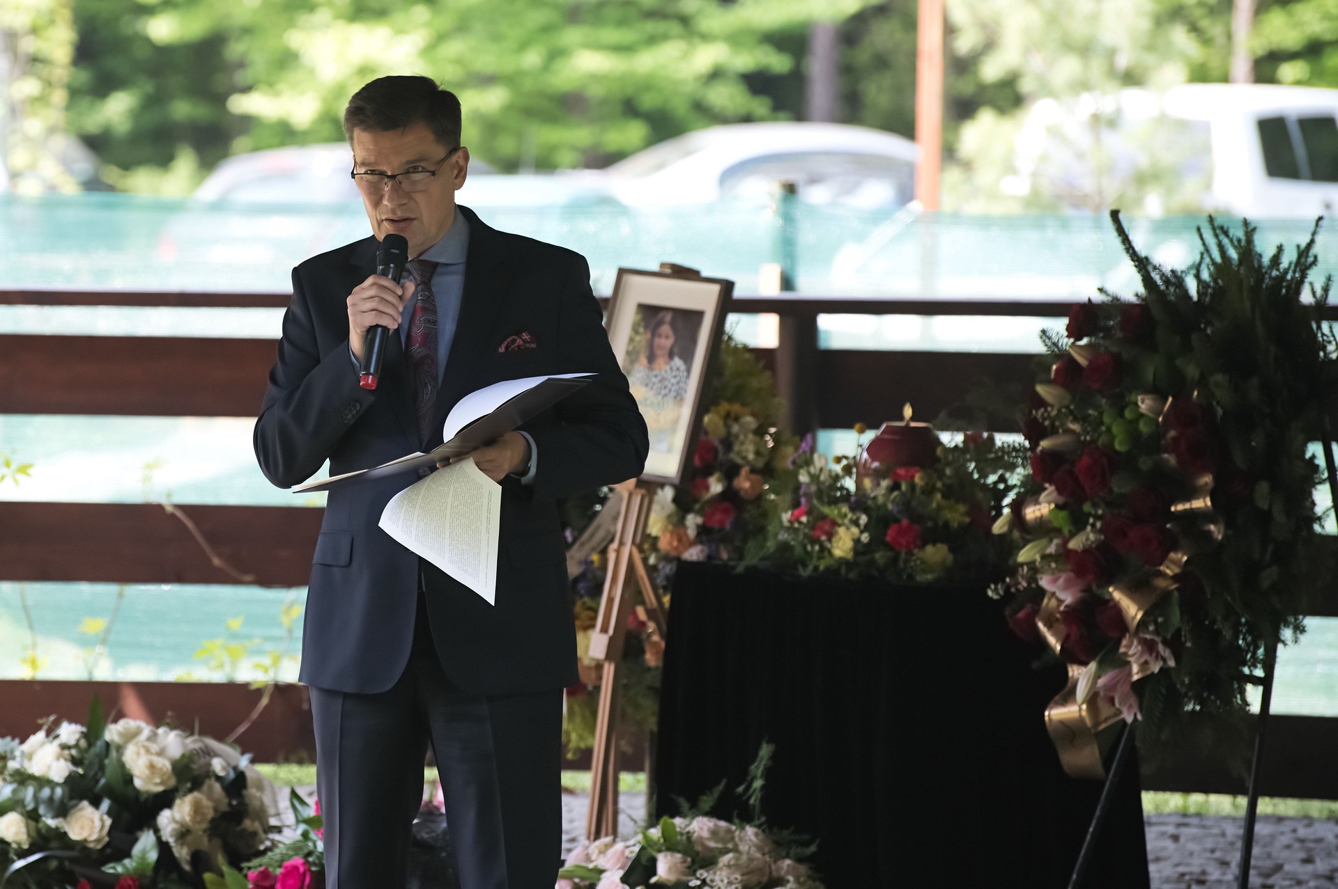 Mowa pożegnalna dyrektora Biblioteki Uniwersyteckiej dra Krzysztofa Nierzwickiego. Barbarka k. Torunia, 14 maja 2021 r. Fot. Tomasz Dorawa. Fotografia ze zbiorów Biblioteki Uniwersyteckiej w Toruniu
