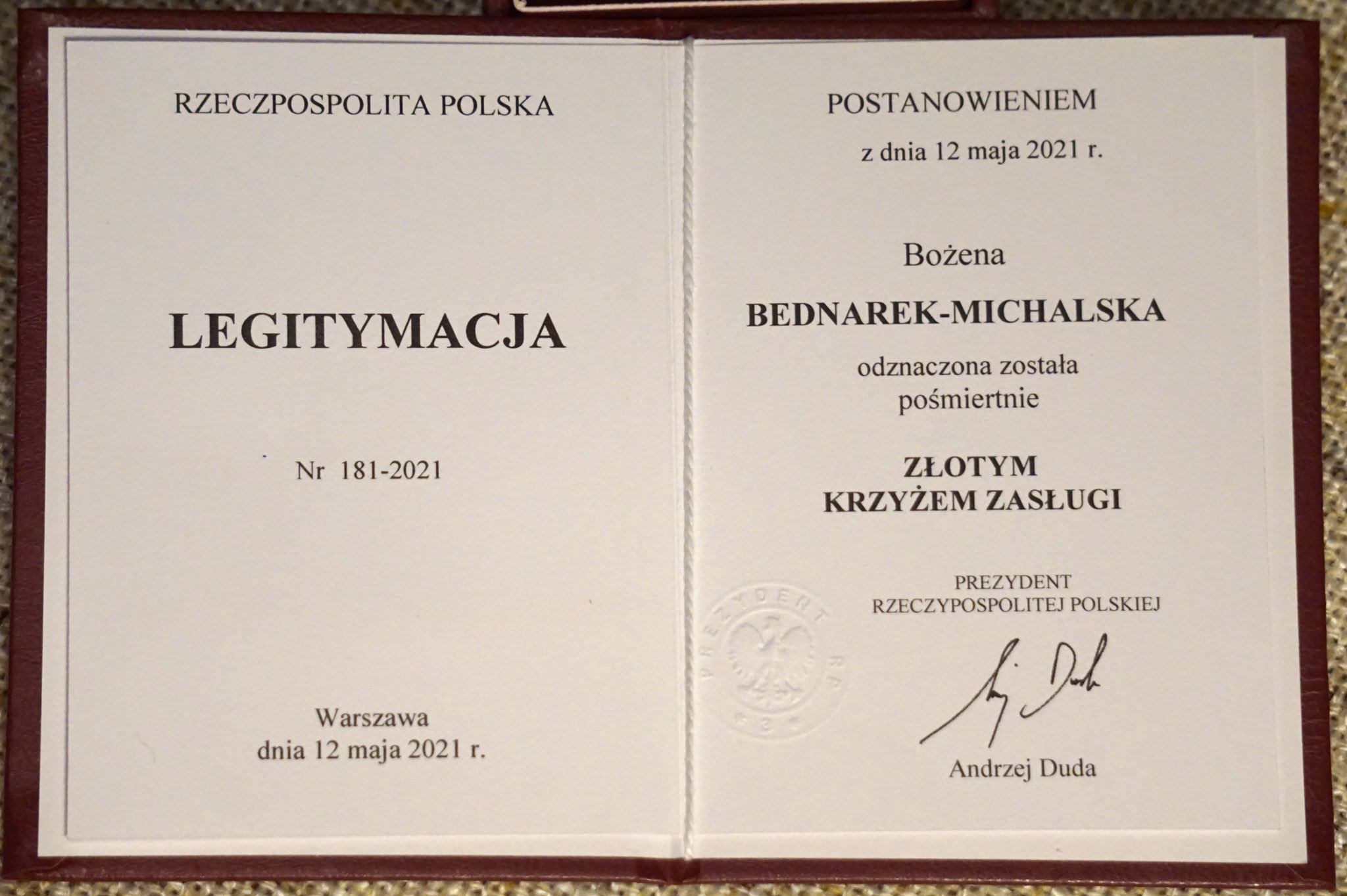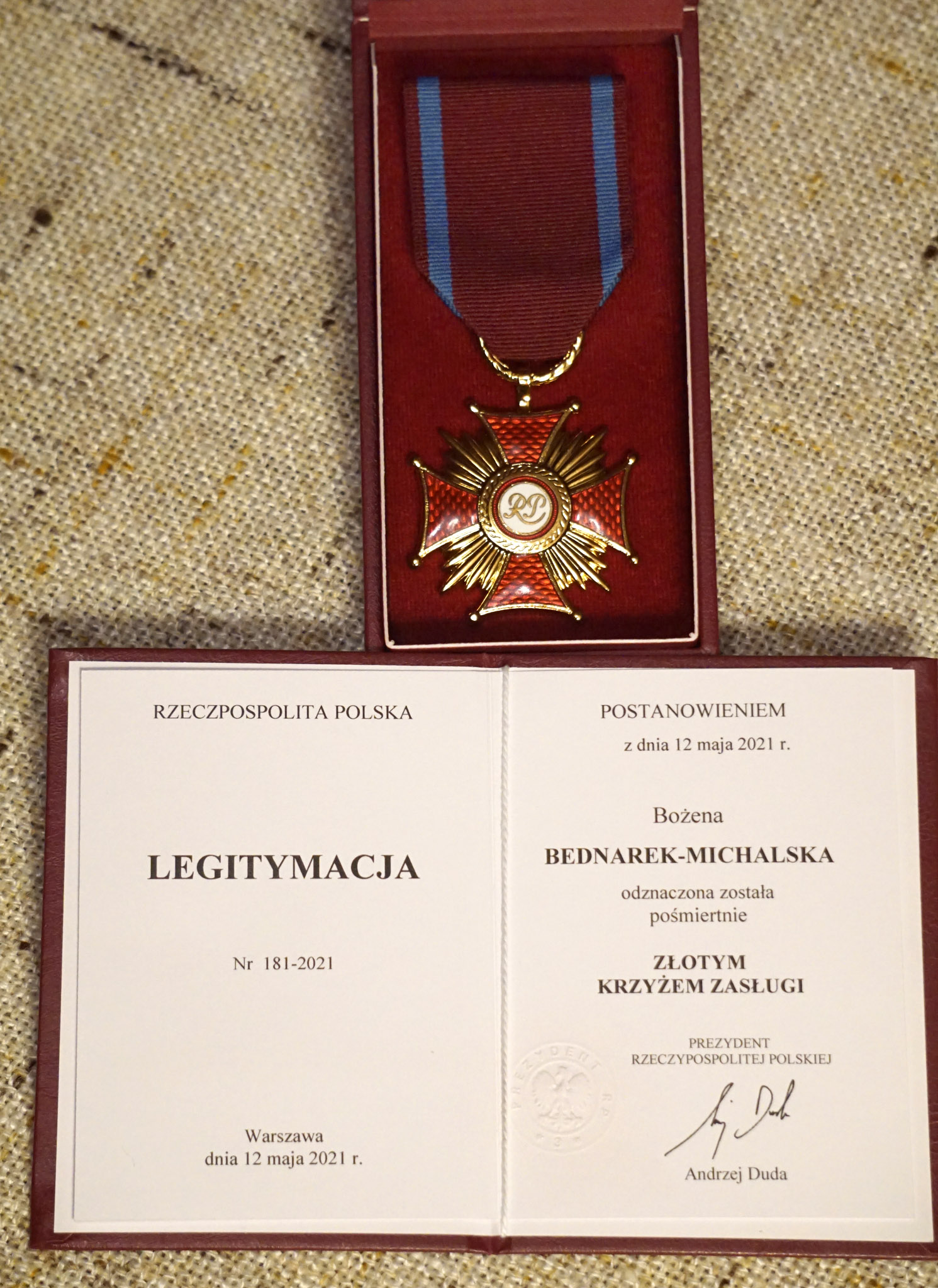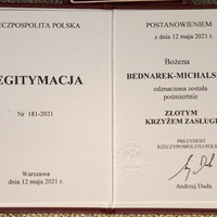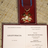 Przyznany pośmiertnie 12 maja 2021 r. Bożenie Bednarek-Michalskiej przez Prezydenta Rzeczypospolitej Polskiej za zasługi w działalności na rzecz rozwoju bibliotekarstwa i wręczony przez Prezydenta Miasta Bydgoszczy Józefa Ramlau na ręce męża Miłosza Michalskiego w dniu pogrzebu na cmentarzu Najświętszego Serca Pana Jezusa w Bydgoszczy. Fot. Miłosz Michalski, 2022 r. Archiwum prywatne rodziny Michalskich
