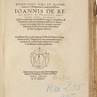 Johannes Regiomontanus (Johannes Müller) był matematykiem, astronomem i astrologiem działającym w Wiedniu, Budzie i Norymberdze. Jest to pierwsze wydanie powstałego w latach 1462–1464 traktatu o trygonometrii płaskiej i sferycznej, traktującego trygonometrię jako oddzielną dyscyplinę matematyczną.