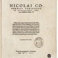 Nicolai Copernici Torinensis De Revolvtionibvs Orbium coelestium, Libri VI. Habes in hoc opere iam recens nato, [et] aedito, studiose lector, Motus stellarum, tam fixarum, quam erraticarum, cum ex ueteribus, tum etiam ex recentibus obseruationibus restitutos: [et] nouis insuper ac admirabilibus hypothesibus ornatos. Habes etiam Tabulas expeditissimas, ex quibus eosdem ad quoduis tempus quam facillime calculare poteris. Igitur eme, lege, fruere.