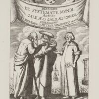 Kopernik dyskutujący z Arystotelesem i Ptolemeuszem, winieta tytułowa, rytowana przez Jacoba van der Heyden, do dzieła Galileusza: Systema cosmicum ... in quo quatuor dialogis, de duobus maximis mundi systematibus, Ptolemaico & Copernicano., London: Thomas Dicas for D. Pauli, 1663. Napisy (tytulatura): „DIALOGVS/ DE SYSTEMATE MVNDI / Autore / GALILÆO GALILÆI LYNCEO / SERENISSIMO / FERDINANDO II HETRVR MAGNO DVCI dicatus”- na wstędze nad kompozycją; „LONDINI / Prostat voenalis apud Thomam Dicas / 1663” - pod kompozycją.