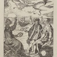 Kopernik dyskutujący z Arystotelesem i Ptolemeuszem, winieta tytułowa [w:] Dialogi tam eos quos edidit de systemate mundi quam quos de motu locali. Leiden: apud Fredericum Haaring et Davidem Severinum, 1700. Napisy: „GALILÆI GALILÆI LYNCEO / Dialogi tam eos quos edidit / DE SYSTEMATE MVNDI / quam quos / DE MOTU LOCALI” - na wstędze ponad kompozycją, „LUGD.BATAV Apud FREDERICUM HAARING et / DAVIDEM SEVERINUM / M.DCC. / Bibliopolas” - pod kompozycją
