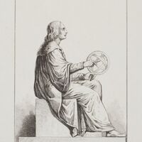 Widok warszawskiego monumentu Mikołaja Kopernika widziany z prawej strony. Astronom ujęty w pozie siedzącej z cyrklem w prawej dłoni i sferą armilarną w lewej dłoni. Rysunek nie obejmuje cokołu. W tle delikatne tło w postaci zakreskowanego pola.