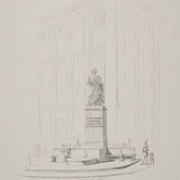 Toruński pomnik Mikołaja Kopernika przedstawiony na tle południowo-wschodniego narożnika Ratusza Staromiejskiego w Toruniu. Na ławce, z lewej strony, kobieta z dzieckiem. Z prawej strony mężczyzna z laską. Za pomnikiem, delikatnie przedstawiona, grupa mieszczan. Napisy: „Druck v A. Dettmers, Berlin Das Copernicus Denkmal zu Thorn” (Pomnik Kopernika w Toruniu) – na osi, pod rysunkiem.