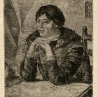 Portret Mikołaja Kopernika siedzącego przy stole, podpierającego dłońmi podbródek. Wykonanie techniką suchej igły przez Hieronima Skurpskiego, artystę malarza, grafika, rysownika, historyka sztuki, muzealnika i działacza kultury, założyciela i pierwszego dyrektora Muzeum Warmii i Mazur w Olsztynie.
