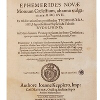 Johannes Kepler (1571–1630) Ephemerides Novae Motuum Coelestium, ab anno vulgaris aerae MDCXVII. Ex Observationibus potissimum Tychonis Brahei, Hypothesibus Physicis, & Tabulis Rudolphinis; Ad Meridianum Uranopyrigicum in freto Cimbrico, quem proxime circumstant Pragensis, Lincensis, Venetus, Romanus Ab Anno M.DC.XXI. ad M.DC.XXVIII. : Quae ex Tabb. Rudolphi, vel adhuc furgentibus, vel nondum editis, liberiori paulo calculo computatae, ad suum quidem quaeque annum, edi tamen antehac commode non potuerunt ... Authore Joanne Kepplero