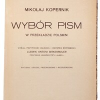 Przekład na język polski w opracowaniu Ludwika Birkenmajera. Przekład obejmuje tylko większą część księgi pierwszej oraz tytuły i wstępy ksiąg kolejnych „De revolutionibus”. Prezentowany na wystawie egzemplarz stanowi drugie, rozszerzone wydanie (pierwsze wydanie ukazało się w Krakowie w 1920 r.).