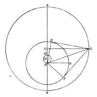 Po prawej: model ruchu Wenus wewnątrz orbity Ziemi ABG. Styczne do orbity Wenus z pozycji Ziemi G wyznaczają maksymalne wschodnie i zachodnie odchylenie (elongację) Wenus od Słońca. Środek orbity Wenus D wędruje po małym kółku DNM wewnątrz obydwu orbit. Środek orbity Ziemi znajduje się w punkcie C, Źródło: De revolutionibus