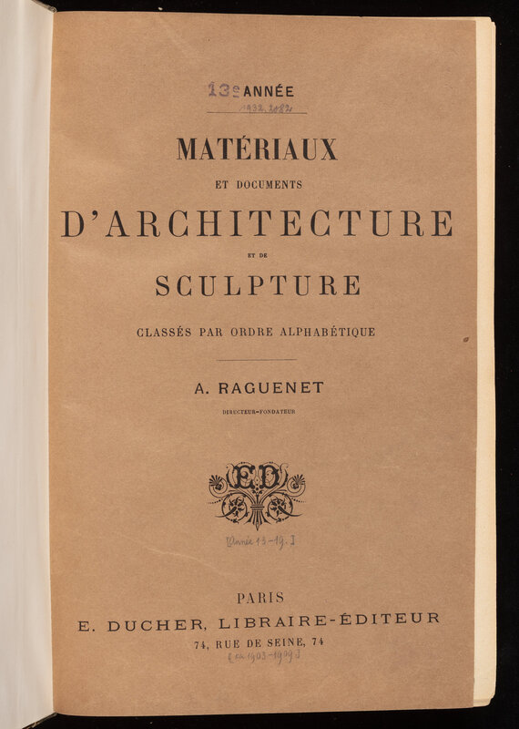 Egzemplarz niekomplety, tabl. od 29-34 i 56-65, prawodopodobie z opracowania "Reproduction des grands ouvrages d'Architecture du XVIIIe Siècle", oprawa z 1958 r.