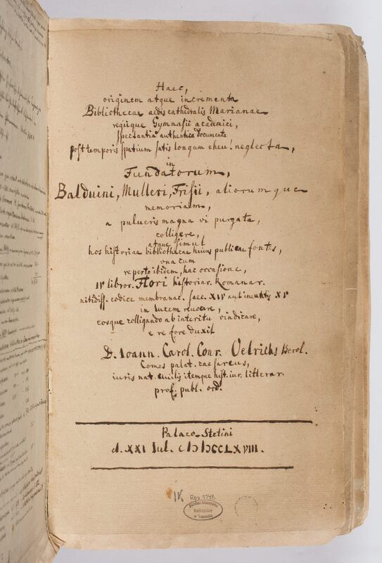 Dokumenty, głównie katalogi, inwentarze i wykazy darów biblioteki gimnazjum, zszyte w kodeks przez Johanna Carla Conrada Oelrichsa profesora gimnazjum w 1768 r.