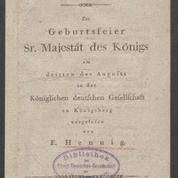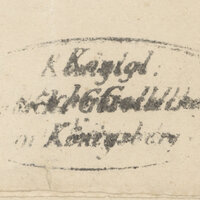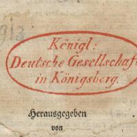 1. Owalna pieczątka w kolorze czerwonym lub granatowym, wewnątrz napis Königl: Deutsche Gesellschaft in Königsberg