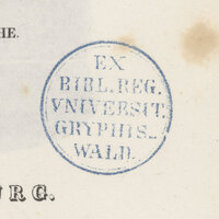 4. Pieczątka okrągła otoczona podwójną linią (zewnętrzna pogrubiona) z napisem w 5 rzędach: EX BIBL. REG. VNIVERSIT. GRYPHIS-WALD.