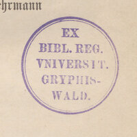 1. Pieczątka owalna w pojedynczej ramce liniowej (wymiary: 18 x 34 mm), czerwony tusz, z napisem w 3 rzędach: "Universitäts-Bibliothek Greifswald."