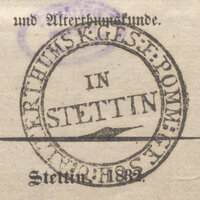 6. Okrągła pieczątka: GES: F: POMM: GESCH: U : ALTERTHUMSK: z zapisem w centrum pieczątki: IN STETTIN