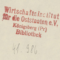 2. Czerwona pieczątka Wirtschaftsinstitut für die Oststaaten e.V. Königsberg (Pr) Bibliothek ; pod pieczątką odręczny czarny zapis cyfr arabskich z kropką, przykłady: 39.22 lub 41. 386. Sygnatura zapisana ołówkiem, składająca się z jednej wielkiej litery i cyfr arabskich np. K 133; K 218 -
