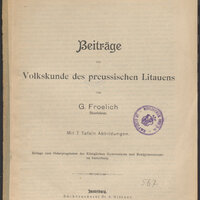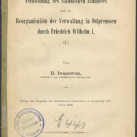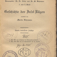 1. Granatowa, okrągła pieczątka: Staatl. Realgymnasium. Lehrer-Bibliothek. Schlawe, sygnatura odręczna zapisana ołówkiem składająca się z litery i liczb arabskich.