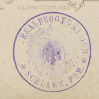 6. Czarna, okrągła pieczątka z herbem Sławna: PROGYMNASIUM IN SCHLAWE, sygnatura odręczna zapisana czarnym tuszem np. C163 ª. Ta sama pieczątka była także w kolorze fioletowym: PROGYMNASIUM IN SCHLAWE *