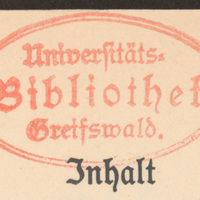 - Owalna czerwona pieczątka: Universitäts=Bibliothek Greisswald. ; Nalepka z sygn.: nd A II 13525