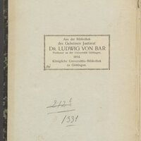 - Prostokątna naklejka z informacją o proweniencji książki z biblioteki profesora prawa Ludwiga Bara (1836-1913), którego zbiory po śmierci trafiły do zbiorów Biblioteki Uniwersyteckiej w Greifswaldzie.
