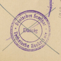 - Pieczątka okrągła: Deutsches Seminar Technische Hochschule Danzig. Grzebiet z sygnaturą