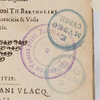 Anatomia Ex Caspari Bartholini, Parentis, Institutionibus Omniumque Recentiorum et propriis Observationibus Tertium ad sanguinis Circulationem Reformata - okrągła fioletowa pieczątka: Bibliothek des Vereins prakt. Aerzte zu Mitau, okrągła zielona pieczątka E MVSEO CVRON. -