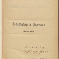 Volksthümliches in Ostpreußen T. 2 - dedykacja autorska dla Rudolfa Reicke (1825-1905), niemieckiego historyka, znawcy życia i twórczości Imanuela Kanta, redaktora "Altpreussische Monatsschrift" -