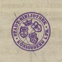 - Zapiska proweniencyjna; okrągła pieczątka: STADT-BIBLIOTHEK KÖNIGSBERG i. PR.; sygnatura Od 1430 (8°) 4°.
