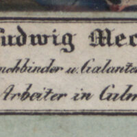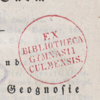- Pieczątka okrągła (czerwona) Ex Bibliotheca Gymnasii Culmensis. Naklejka introligatora: Ludwig Meck. Buchbinder u. Galanterie. Arbeiter in Culm.