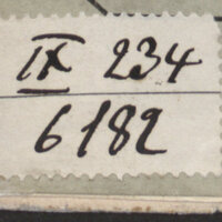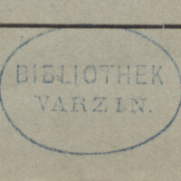 - Owalna fioletowa pieczątka: BIBLIOTHEK VARZIN oraz naklejka z sygnaturą