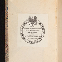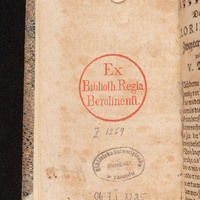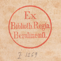 - 1. Superekslibris (herb - tłoczenie złotem na górnej okładzinie) ; 2. Pieczątka okrągła (tusz czerwony) „Ex Biblioth. Regia Berolinensi.” ; 3. Ekslibris donacyjny „Bibliotheca Regia Berolinensis. Dono Friderici Wilhelmi IV Regis Augustissimi D. V. Nov. MDCCCL. Ex Bibliotheca B. M. Hartw. Gregorii De Meusebach.” ; 4. Sygnatura (ołówek) Z 1269.