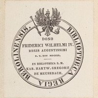 Der Clorinden Anderer Theil. Oder Liebs-Geschicht ... - ekslibris donacyjny „Bibliotheca Regia Berolinensis. Dono Friderici Wilhelmi IV Regis Augustissimi D. V. Nov. MDCCCL. Ex Bibliotheca B. M. Hartw. Gregorii De Meusebach.” -