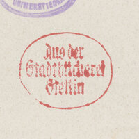 - Pieczatka owalna czerwona: Aus der Stadtbücherei Stettin; nalepkowa i ołówkowa sygnatura Mx 1383