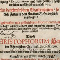 Preussische Kirchen-Historia Darinnen Von Einführung der Christlichen Religion in diese Lande, wie auch von der Conservation, Fortpflantzung, Reformation und dem heutigen Zustande derselben ausführlich gehandelt wird - strona przytytułowa oraz strona tytułowa -