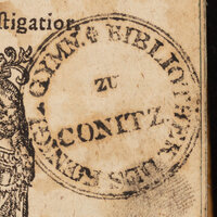 - 1. Pieczątka "Bibliothek des Königl. Gymn. zu Conitz." ; 2. Nalepka na grzbiecie z sygnaturą.