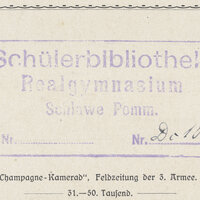 - Pieczątka kwadratowa: Schülerbibliothek Realgymnasium Schlawe Pomm z nr sygn. Pieczątka okrągła Staatl. Realgymnasium Schüler-Bücherei. Schlawe. Nr sygn. Do[?] 106
