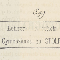 - Pieczątki: 1. okrągła SIEGEL DES GYMNASIUMS ZU STOLP 2. prostokątna Lehrer-Bibliothek des Gimnasiums zu STOLP