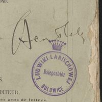 - Pieczątka na stronie tytułowej: Księgozbiór Ludwiki Larischowej. Bulowice