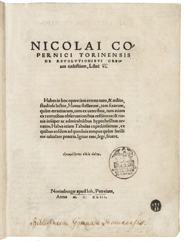 Part of Nicolai Copernici Torinensis De Revolvtionibvs Orbium coelestium, Libri VI. Habes in hoc opere iam recens nato, [et] aedito, studiose lector, Motus stellarum, tam fixarum, quam erraticarum, cum ex ueteribus, tum etiam ex recentibus obseruationibus restitutos: [et] nouis insuper ac admirabilibus hypothesibus ornatos. Habes etiam Tabulas expeditissimas, ex quibus eosdem ad quoduis tempus quam facillime calculare poteris. Igitur eme, lege, fruere.