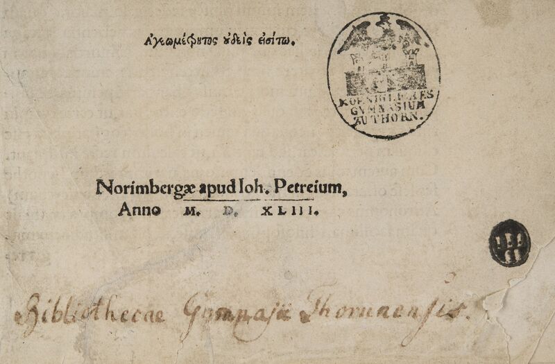 Part of Nicolai Copernici Torinensis De Revolvtionibvs Orbium coelestium, Libri VI. Habes in hoc opere iam recens nato, [et] aedito, studiose lector, Motus stellarum, tam fixarum, quam erraticarum, cum ex ueteribus, tum etiam ex recentibus obseruationibus restitutos: [et] nouis insuper ac admirabilibus hypothesibus ornatos. Habes etiam Tabulas expeditissimas, ex quibus eosdem ad quoduis tempus quam facillime calculare poteris. Igitur eme, lege, fruere.