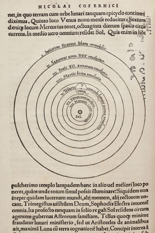 Part of Nicolai Copernici Torinensis De Revolvtionibvs Orbium coelestium, Libri VI. Habes in hoc opere iam recens nato, [et] aedito, studiose lector, Motus stellarum, tam fixarum, quam erraticarum, cum ex ueteribus, tum etiam ex recentibus obseruationibus restitutos: [et] nouis insuper ac admirabilibus hypothesibus ornatos. Habes etiam Tabulas expeditissimas, ex quibus eosdem ad quoduis tempus quam facillime calculare poteris. Igitur eme, lege, fruere.