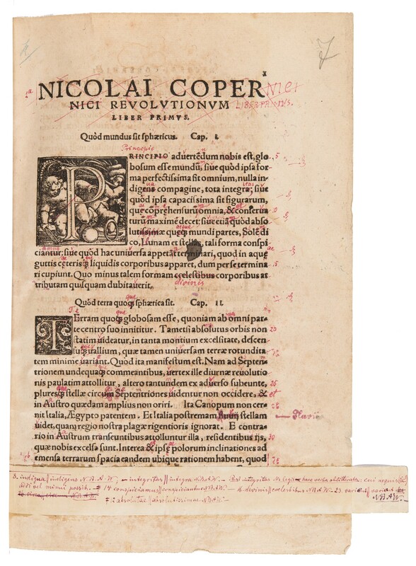 Part of Nicolai Copernici Torinensis De Revolvtionibus orbium coelestium, Libri VI. In Qvibvs Stellarvm Et Fixarvm Et Erraticarvm Motvs, Ex Veteribus atq[ue] recentibus obseruationibus, restituit hic autor. Praeterea tabulas expeditas luculentasq[ue] addidit, ex quibus eosdem motus ad quoduis tempus Mathematum studiosus facillime calculare poterit. Item De Libris Revolvtionvm Nicolai Copernici Narratio prima, per M. Georgium Ioachimum Rheticum ad D. Ioan. Schonerum scripta