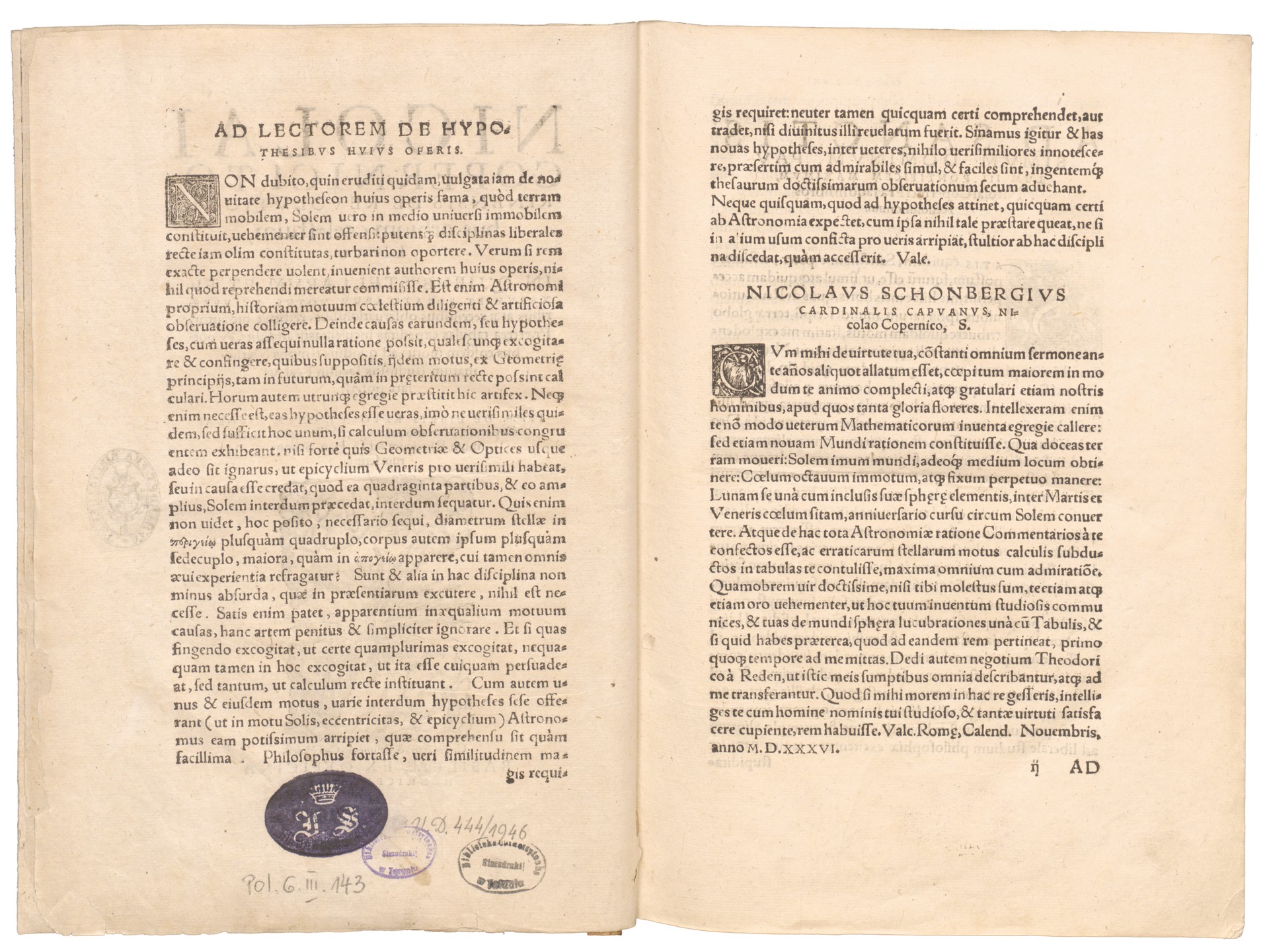 Part of Nicolai Copernici Torinensis De Revolvtionibus orbium coelestium, Libri VI. In Qvibvs Stellarvm Et Fixarvm Et Erraticarvm Motvs, Ex Veteribus atq[ue] recentibus obseruationibus, restituit hic autor. Praeterea tabulas expeditas luculentasq[ue] addidit, ex quibus eosdem motus ad quoduis tempus Mathematum studiosus facillime calculare poterit. Item De Libris Revolvtionum Nicolai Copernici Narratio prima, per M. Georgium Joachimum Rheticum ad D. Ioan. Schonerum scripta