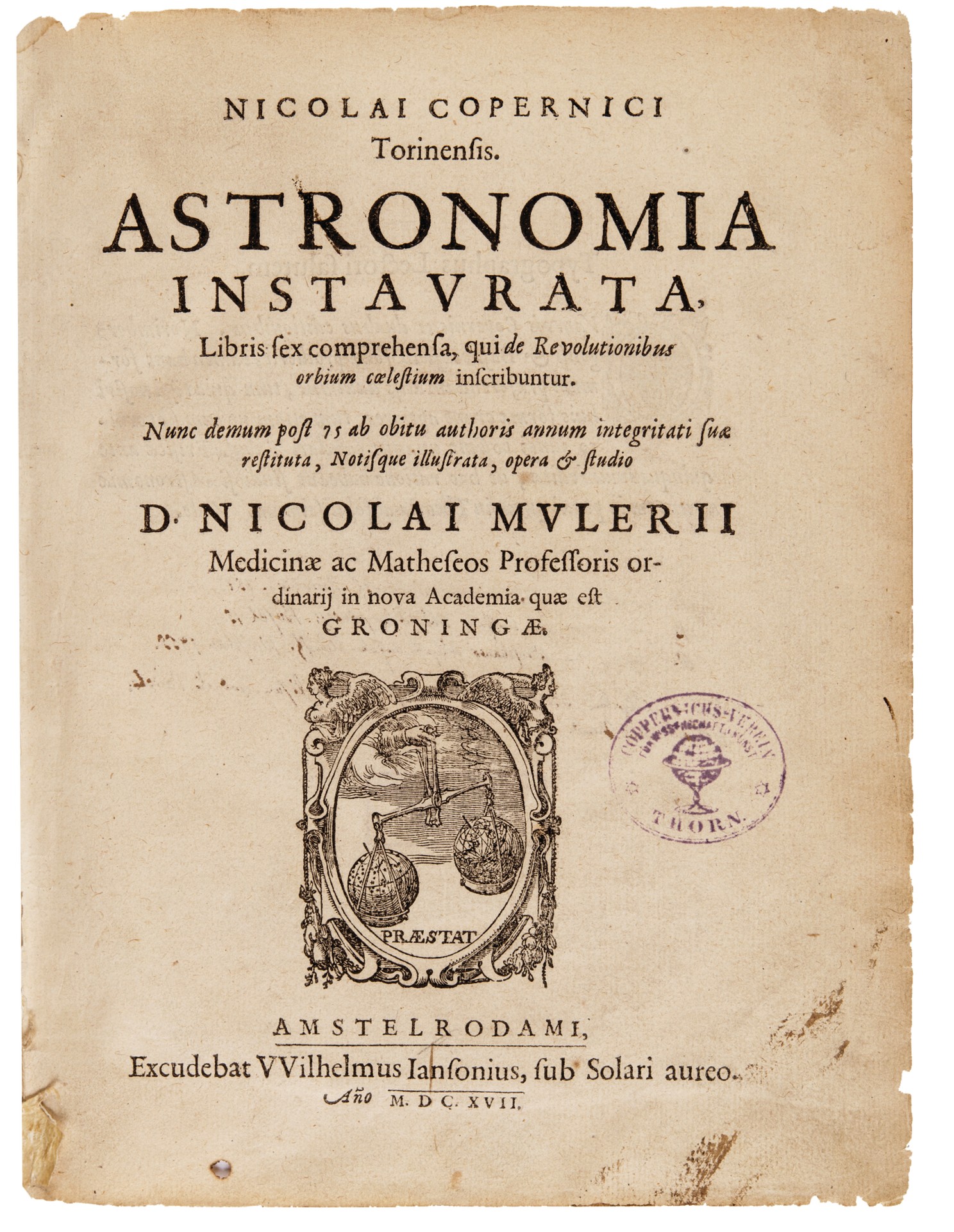 Part of Nicolai Copernici Torinensis Astronomia Instavrata, Libris sex comprehensa, qui de Revolutionibus orbium coelestium inscribuntur. Nunc demum post 75 ab obitu authoris annum integritati suae restituta, Notisque illustrata, opera [et] studio D. Nicolai Mvlerii Medicinae ac Matheseos Professoris ordinarij in nova Academia quae est Groningae