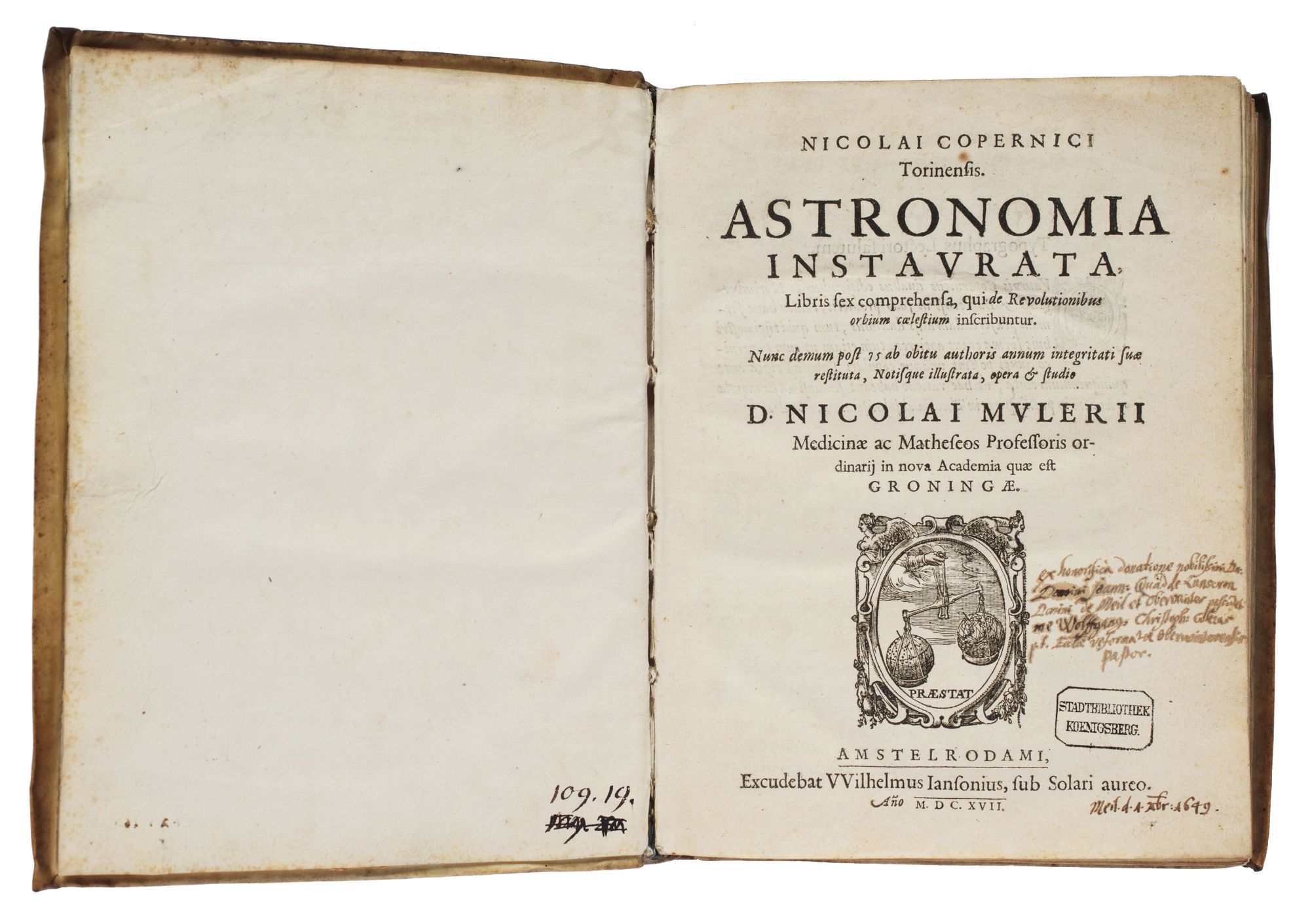 Part of Nicolai Copernici Torinensis Astronomia Instavrata, Libris sex comprehensa, qui de Revolutionibus orbium coelestium inscribuntur. Nunc demum post 75 ab obitu authoris annum integritati suae restituta, Notisque illustrata, opera [et] studio D. Nicolai Mvlerii Medicinae ac Matheseos Professoris ordinarii in nova Academia quae est Groningae